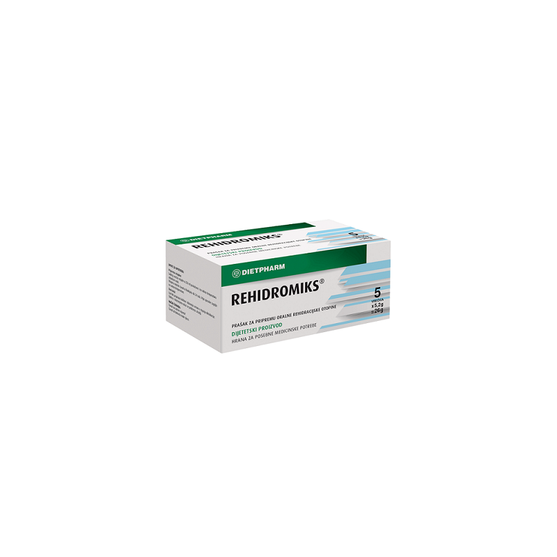 Prašak za pripremu oralne rehidracijske otopine, hrana za posebne medicinske namjene. Namijenjen je za dijetalnu prehranu bolesnika s gubitkom elektrolita i vode. Rehidromiks se primjenjuje kod rehidracije, u prevenciji dehidracije i održavanju hidracije kod dojenčadi, djece i odraslih.Sadržaj vrećice otopite u 250 ml prokuhane i na sobnu temperaturu ohlađene vode.