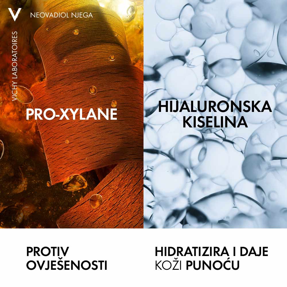 NEOVADIOL DNEVNA NJEGA ZA GUSTOĆU I PUNOĆU KOŽE U PERIMENOPAUZI sadrži snažan spoj koncentriranih dermatološki aktivnih sastojaka. Kombinacija Proxylana i ekstrakta sjemenki sene osmišljena je sa svrhom ublažavanja vidljivih promjena na koži uzrokovanih hormonima. Hijaluronska kiselina vraća punoću koži i poboljšava njezinu elastičnost.