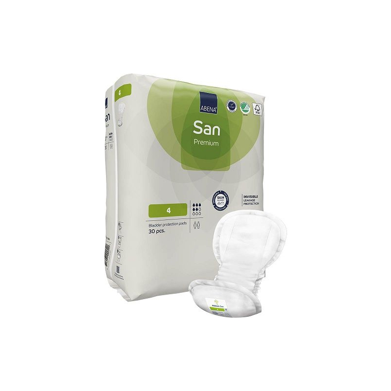 Abena San Premium 4 - Ulošci za inkontinenciju s vrhunskom kvalitetom i anatomskim oblikom. Ulošci su namijenjeni laganoj do umjerenoj inkontinenciji i opremljeni su jezgrom visokih performansi s